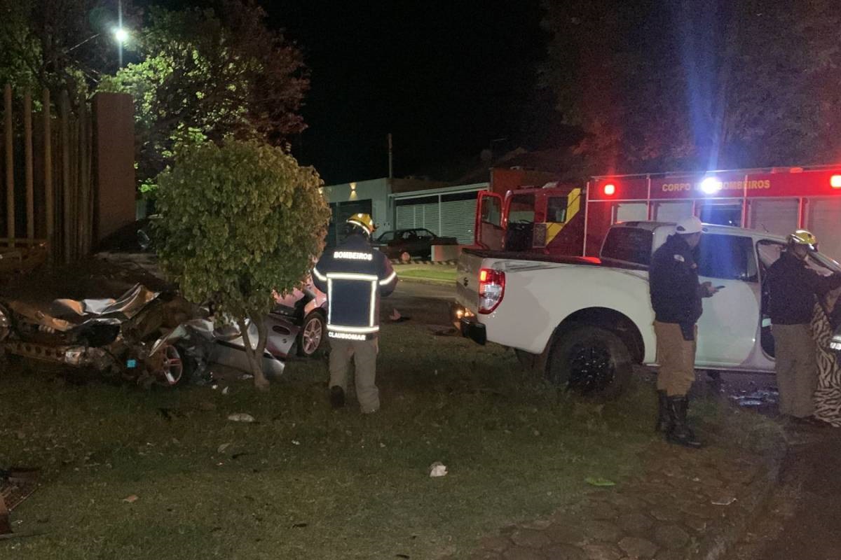 Uma forte colisão deixou duas pessoas feridas durante a madrugada deste domingo (21) no cruzamento da Rua Txikaos com a Rua Tupinambás, no Bairro Santa Cruz em Cascavel.