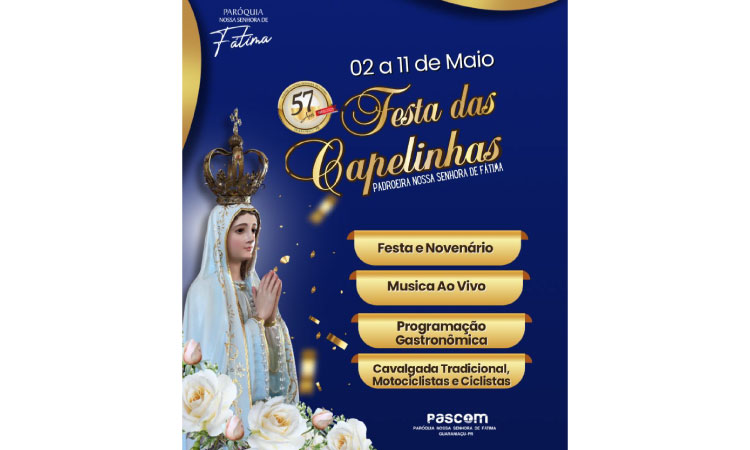A organização é da PASCOM da Paróquia Nossa Senhora de Fátima, que convida toda a população a participar deste momento de fé e confraternização.