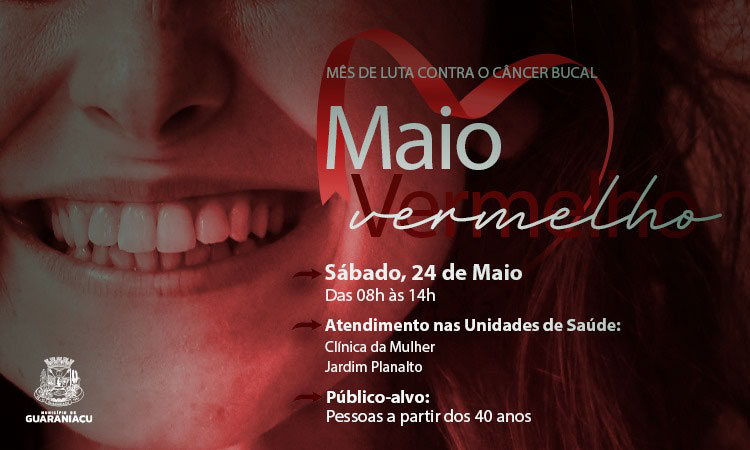 No próximo sábado, 24 de maio, a secretaria de Saúde de Guaraniaçu realiza o Dia D da Saúde Bucal, com atividades voltadas à conscientização e prevenção do câncer de boca, como parte da campanha "Maio Vermelho". A mobilização acontece das 8h às 14h nas Unidades de Saúde do Bairro Bertuol (Clínica da Mulher) e do Jardim Planalto, e será direcionada especialmente a pessoas com mais de 40 anos.