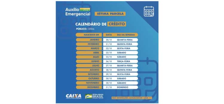 Trabalhadores informais e inscritos no Cadastro Único para Programas Sociais do Governo Federal (CadÚnico), nascidos em dezembro, podem sacar, a partir de hoje (19), a sétima parcela do auxílio emergencial 2021. O dinheiro foi depositado nas contas poupança digitais da Caixa Econômica Federal em 31 de outubro.