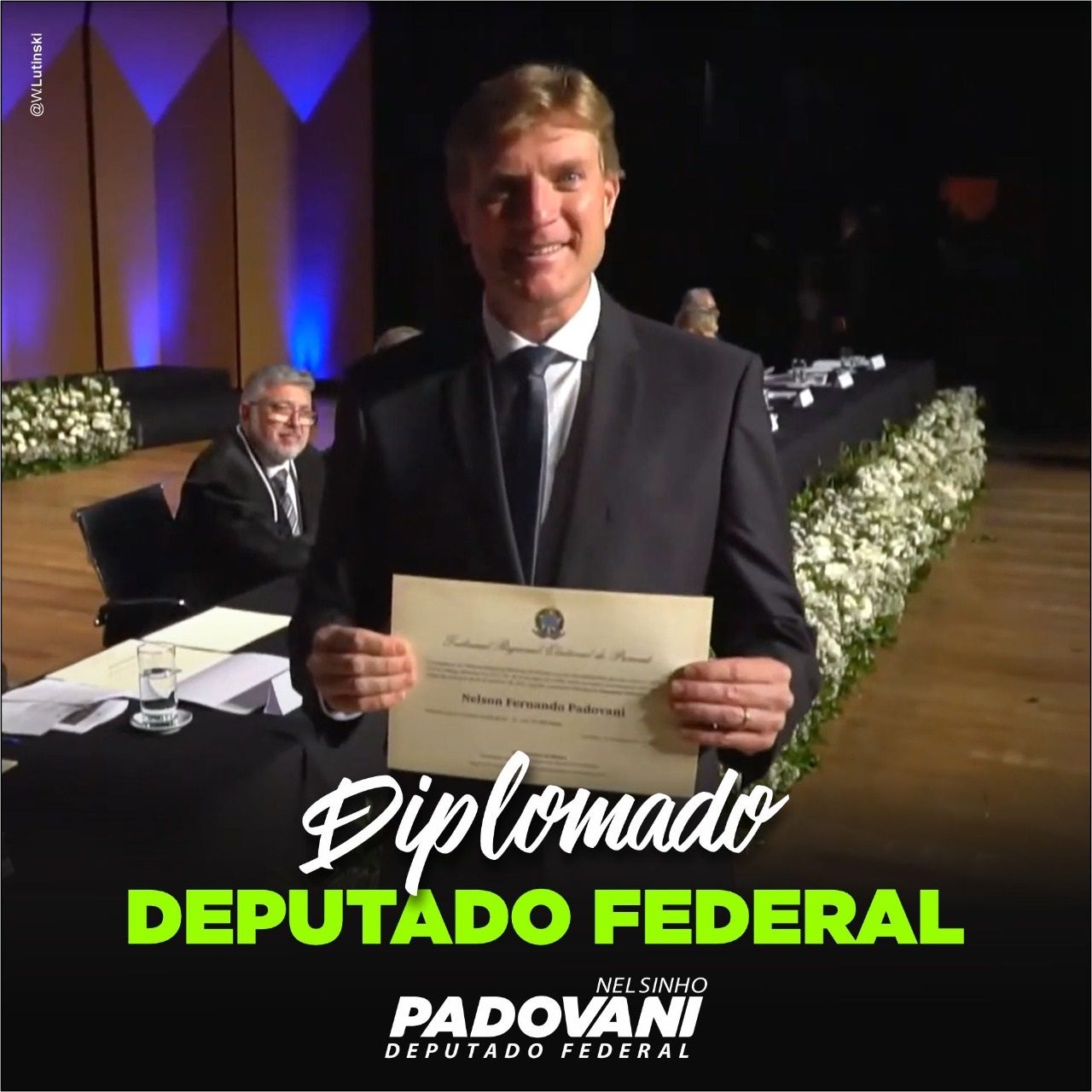 Um dos diplomados no evento foi Nelsinho Padovani (União Brasil), único representante de Cascavel a eleger-se para a Câmara Federal. Ele segue o caminho do pai, Nelson Padovani, que também foi deputado federal por dois mandatos.