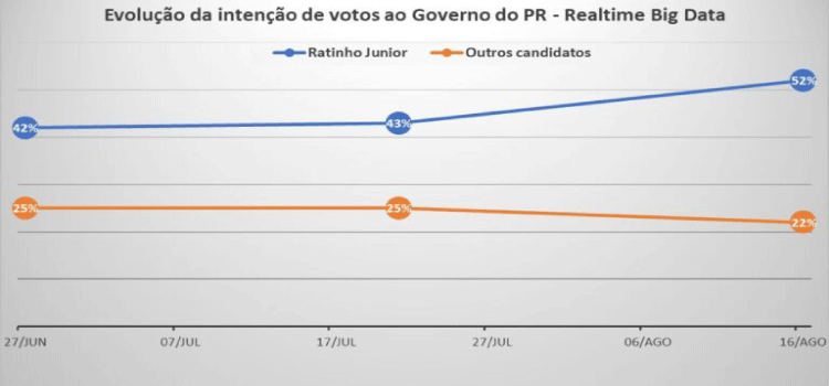 O Instituto RealTime Big Data divulgou nesta terça-feira (16) o seu terceiro levantamento sobre a disputa ao Governo do Paraná. Desta vez contratada pela Tv Record, esta é a primeira realizada após o registro oficial das candidaturas, e elevou a perspectiva de vitória do atual governador do PSD no 1ᵒ turno, que chegou a 52% das intenções de voto, contra 22% de todos os seus adversários somados.