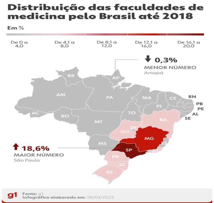 Mapa mostra a distribuição desigual de cursos de medicina pelo país — Foto: Arte/g1