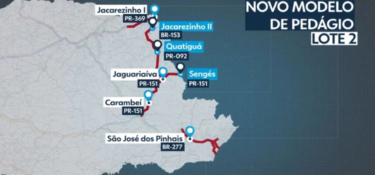 A nova modelagem dos pedágios divide em seis partes o conjunto de rodovias a ser concedido à iniciativa privada no Paraná. O lote 2 contempla trechos das seguintes rodovias paranaenses: